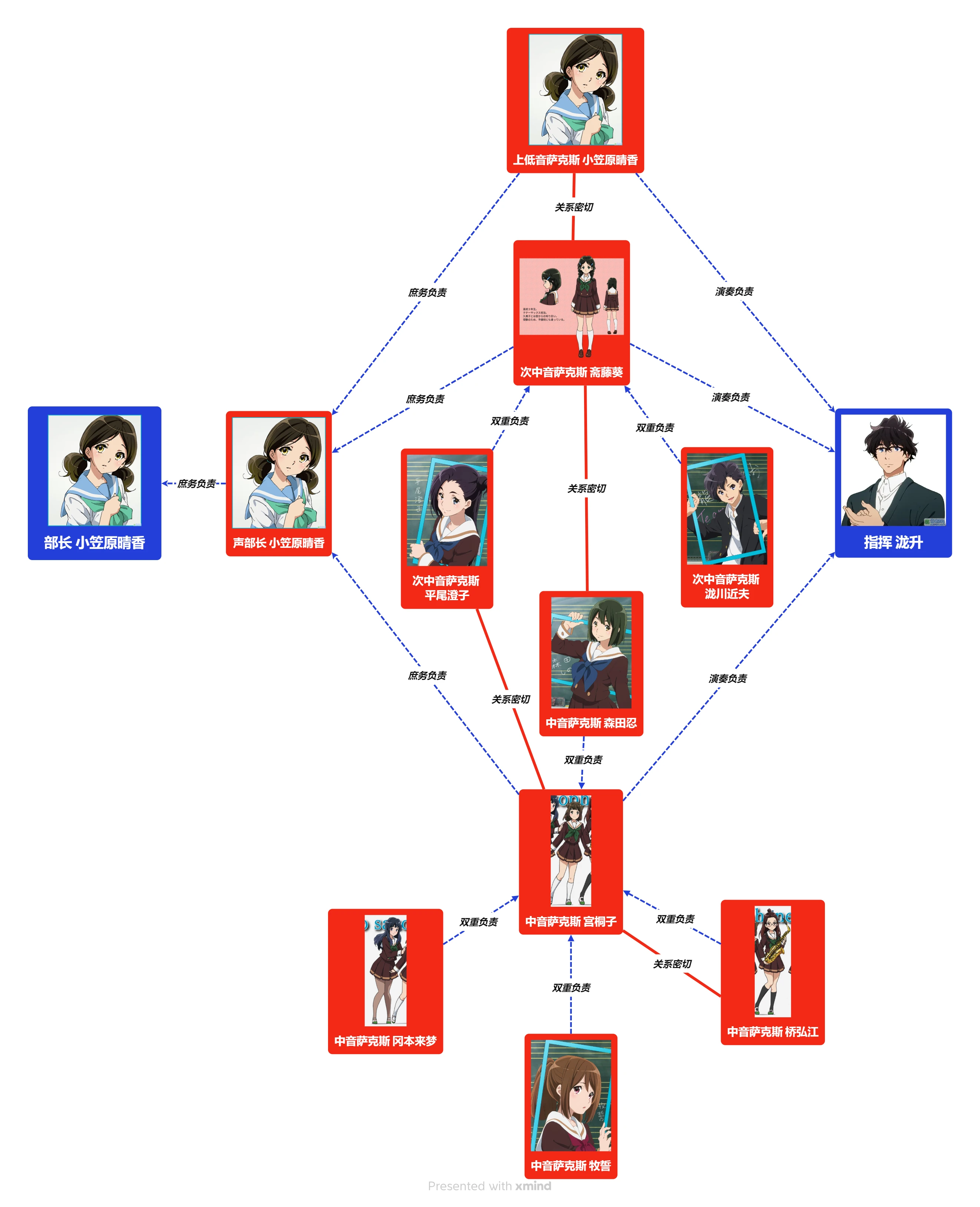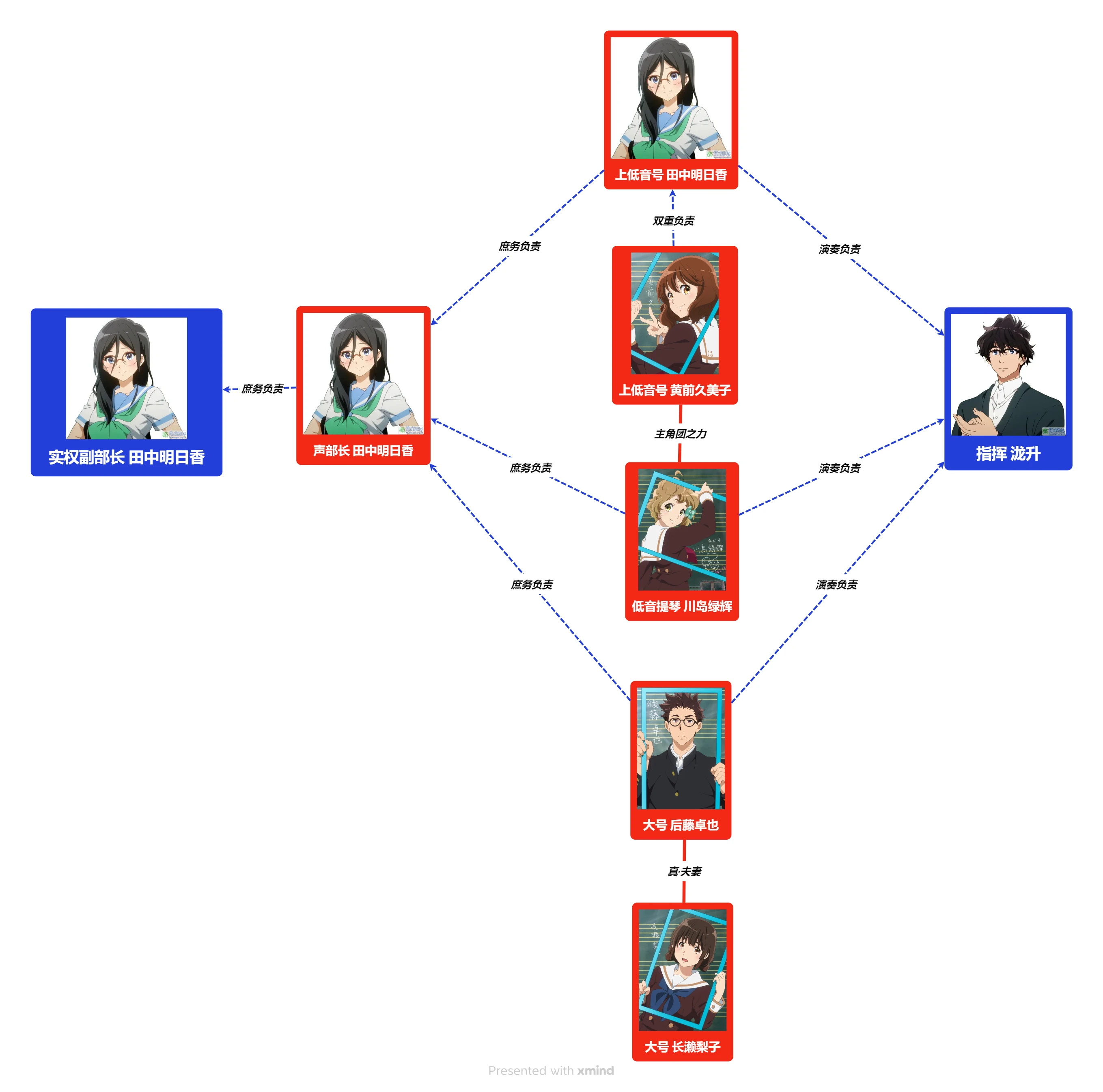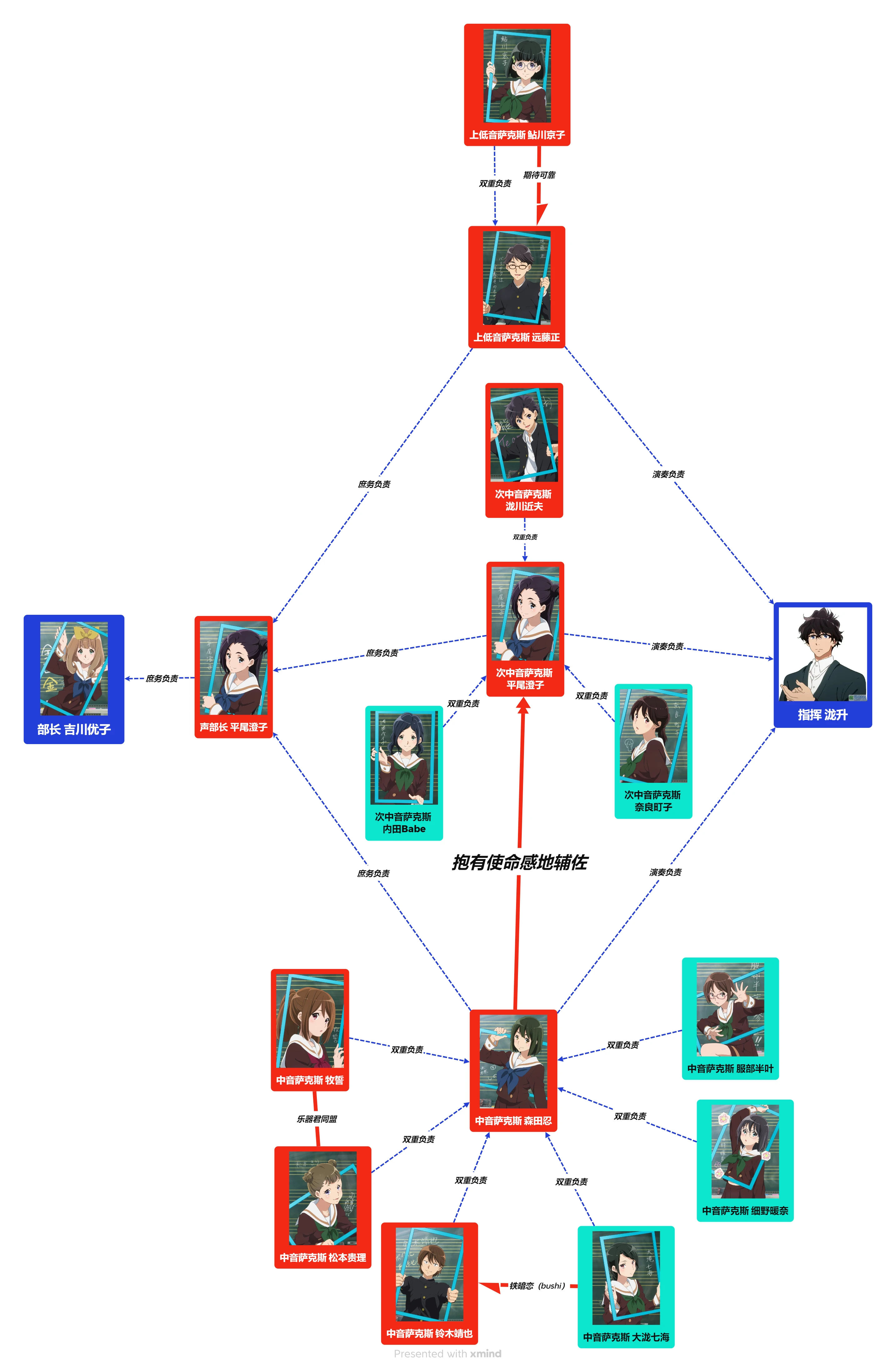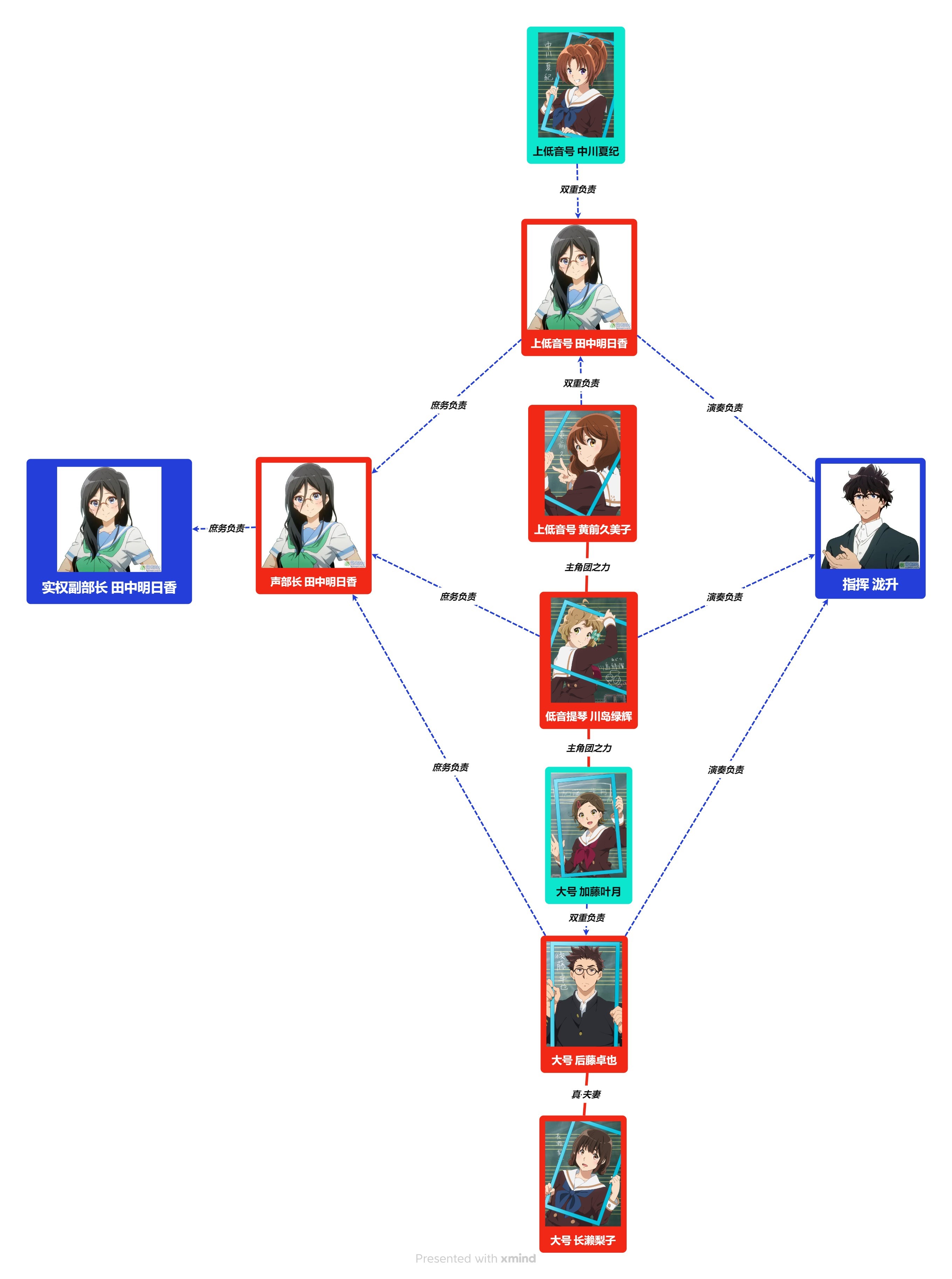 蓝色线及箭头代表架构上的负责关系,其中双重负责意味着演奏和庶务的双重,象征着架构上的天然服从,红色线及箭头代表可能影响权力结构的密切人际关系,下同