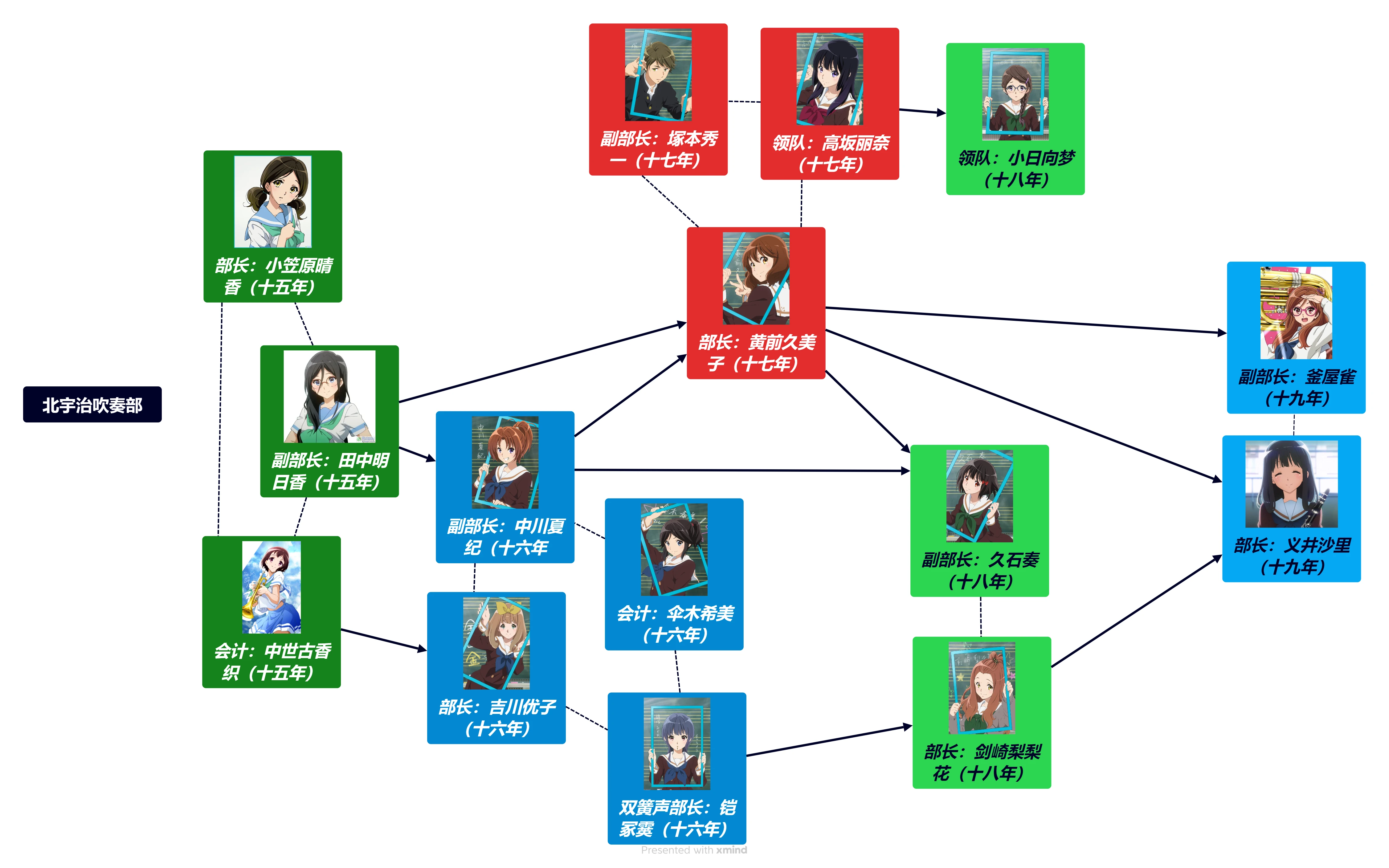 可以看到,两位典型的弱势领导对上对下都缺乏传承,而这张图上还有一人也有类似的情况,也许有读者会有疑问,冢本秀一算弱势领导吗?笔者以为是否定的。笔者以为北宇治在黄前十七年的时候存在一个以冢本秀一为核心的跨声部半松散团体,这个团体可以在必要的时候充当类似冢本秀一基本盘的作用,这个团体就是北宇治吹奏部的男生们。从黄前十七年的县祭来看,冢本秀一在这个团体里都号召力还是不错的,除了前田兄弟估计是结伴,铃木靖也和远藤正大概分别被大泷七海和鲇川京子看得死死的,该到的人基本全部到齐了。北宇治男生固然是少,但即便是不算黄前十七年的新生,所有男生加起来人数已经只比算上釜屋雀他们的低音声部少一人了,可见冢本秀一并非没有影响议题的能力,因此冢本秀一并非弱势领导。