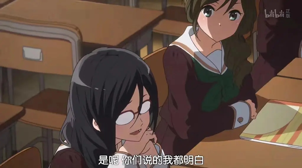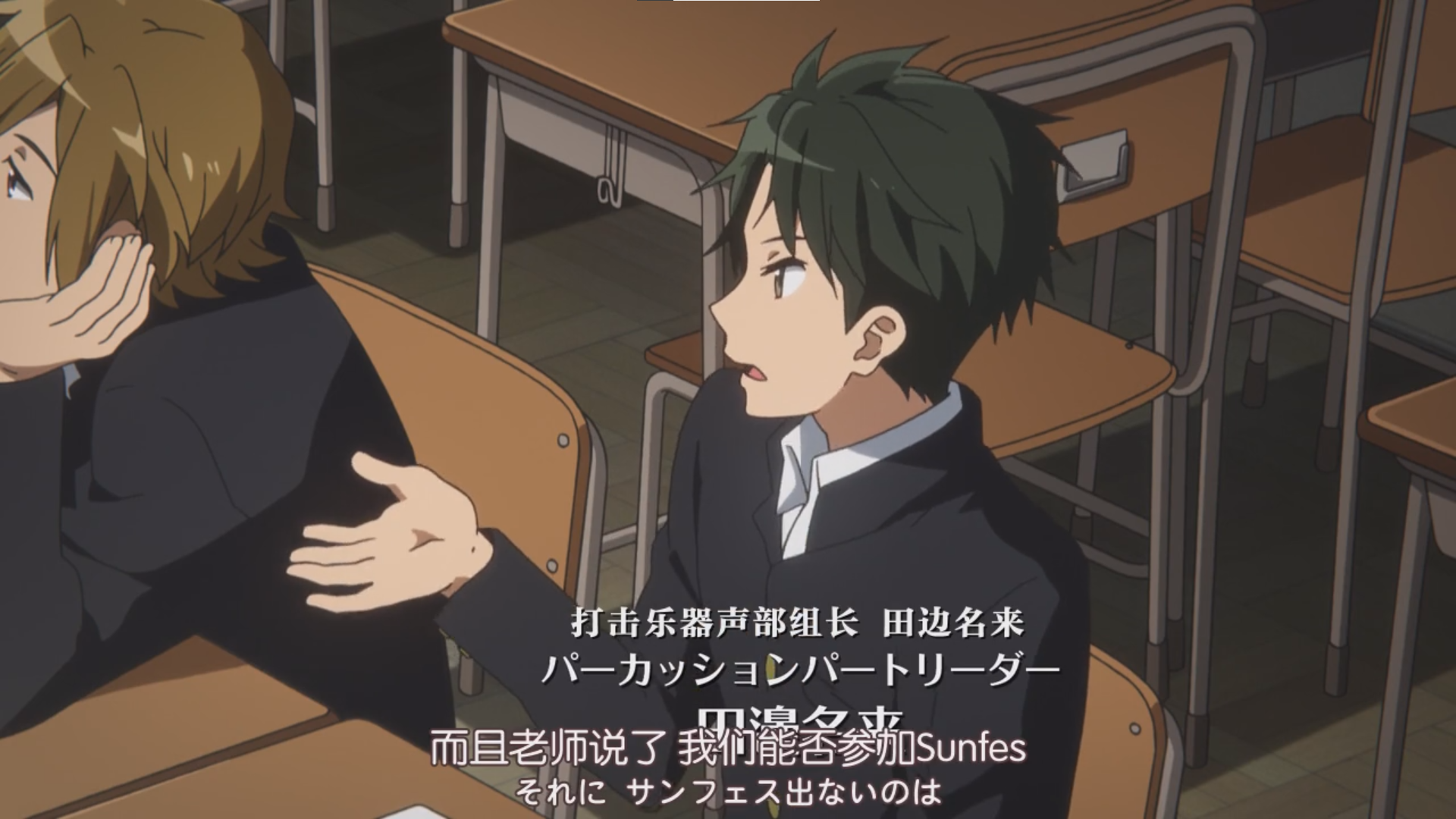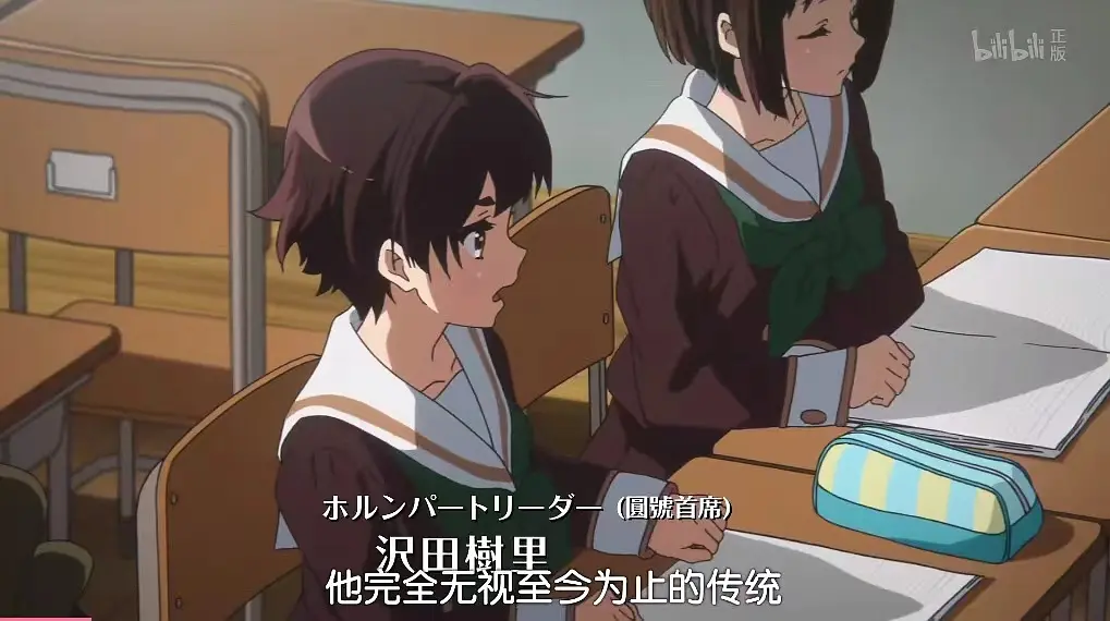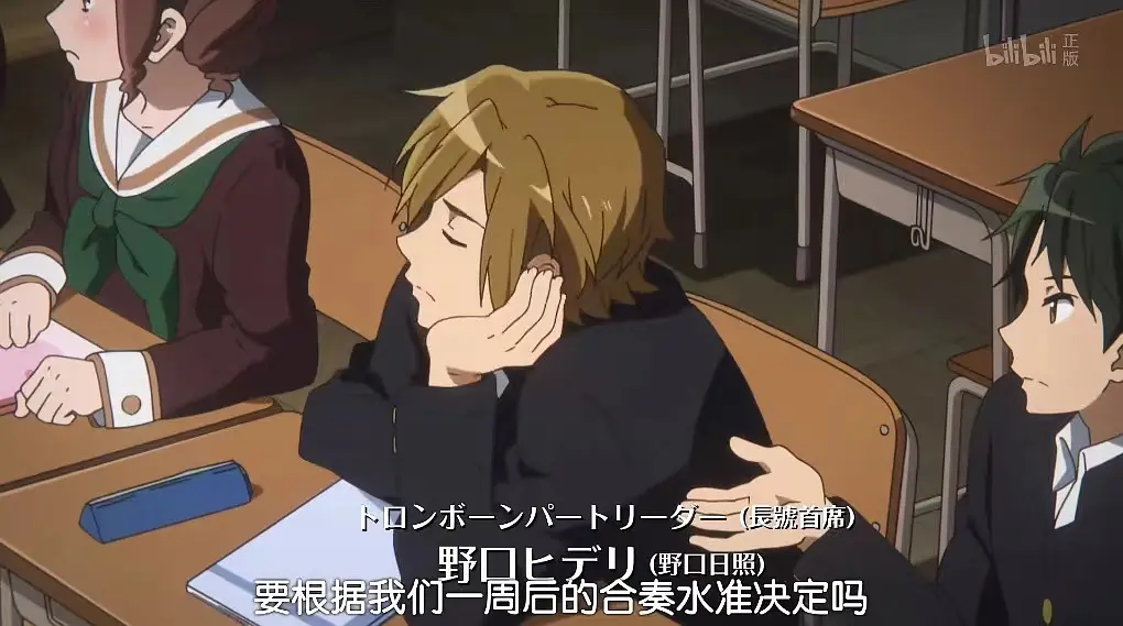 10. 中世古第三个发言试图扭转局面,得到了田边名来(打击组)的附和,但田边的发言水平对比来看是比较低的,属于单纯地就事论事,旁边的野口日照(长号)直接睡觉。这里表现出男生在吹奏部内属于边缘群体,体会不到核心圈平常对话下的刀光剑影。