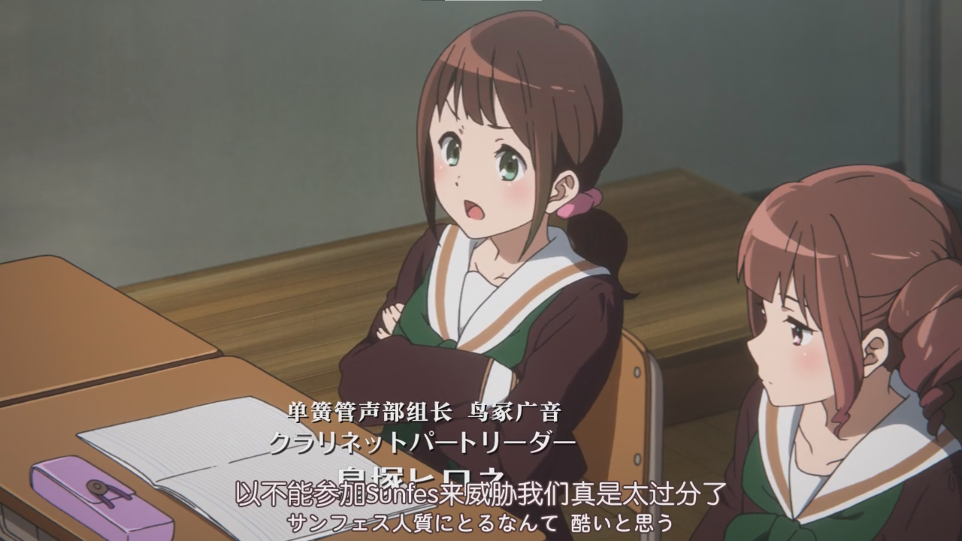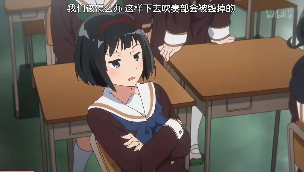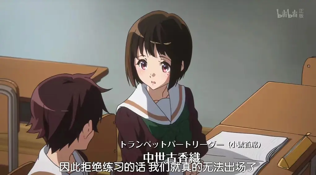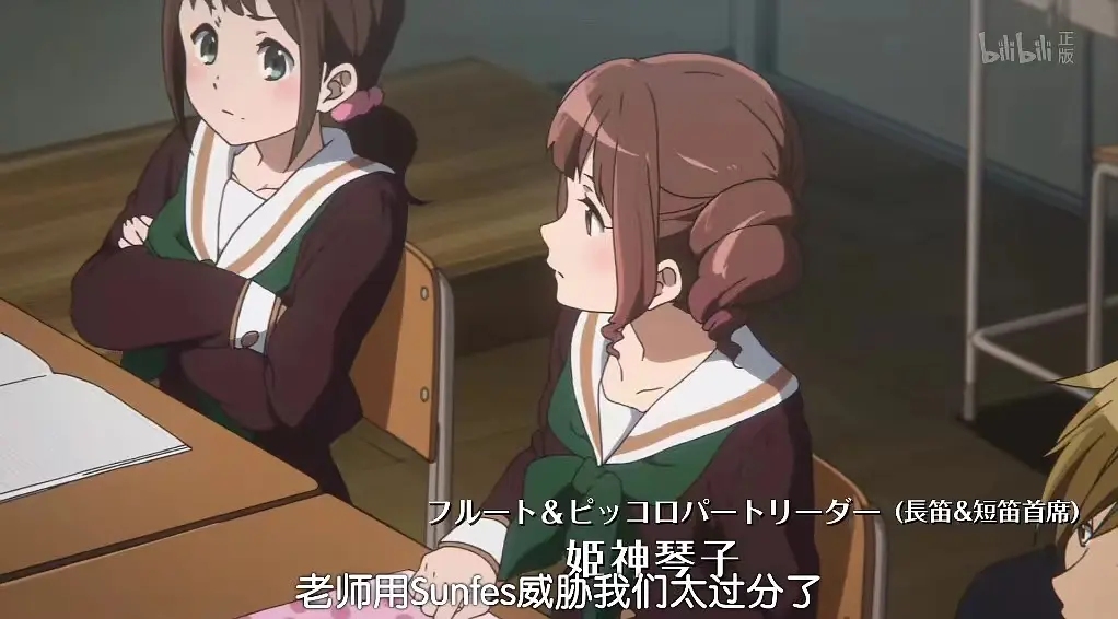 15. 此刻未来的萨克斯组首席平尾澄子与一众路人在门外监听,同是萨克斯组二年生的森田忍却与大佬们(在场的其他二年生均为未来首席)在教室等消息。森田忍后来落选a编掩面痛哭,选拔失利可能严重打击了她在组内的地位。