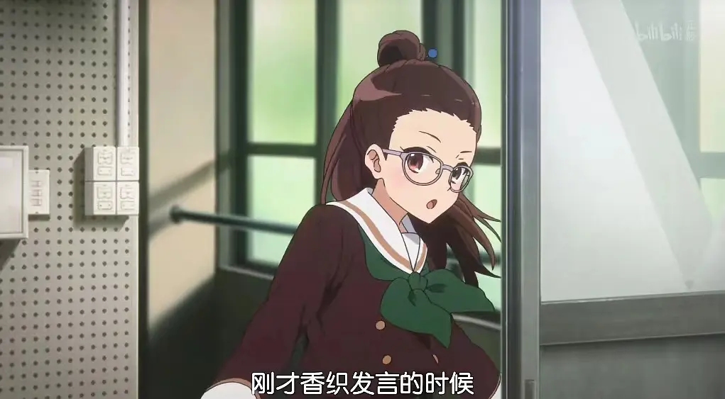 11. 会议上有三组扭头倾听的动作,分别是姬神琴子(长短笛)看向鸟冢,泽田树里看向中世古,喜多村来南(巴松双簧管)看向明日香,其中泽田树里扭头的角度最大,几乎是以一种单挑辩论的姿态完全面向正在发言的中世古。