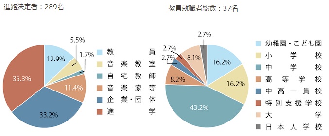 日本通常说的“音大”,指的是国公立大学的音乐学部、私立的音乐大学,以及私立大学的音乐学部。广义上的“音大”还包括大学教育学部(相当于国内的师范)下面的音乐专业,报考教育学部音乐科的考生往往也会同时报私立大学音乐学部作为平行志愿,两者的考试内容和毕业去向差别都不大。由于成为音乐家、演奏家的门槛非常高,即使音大毕业生,绝大多数也是去和音乐无关的普通企业,比如2023年国立音乐大学(名字叫“国立”)的毕业进路统计: